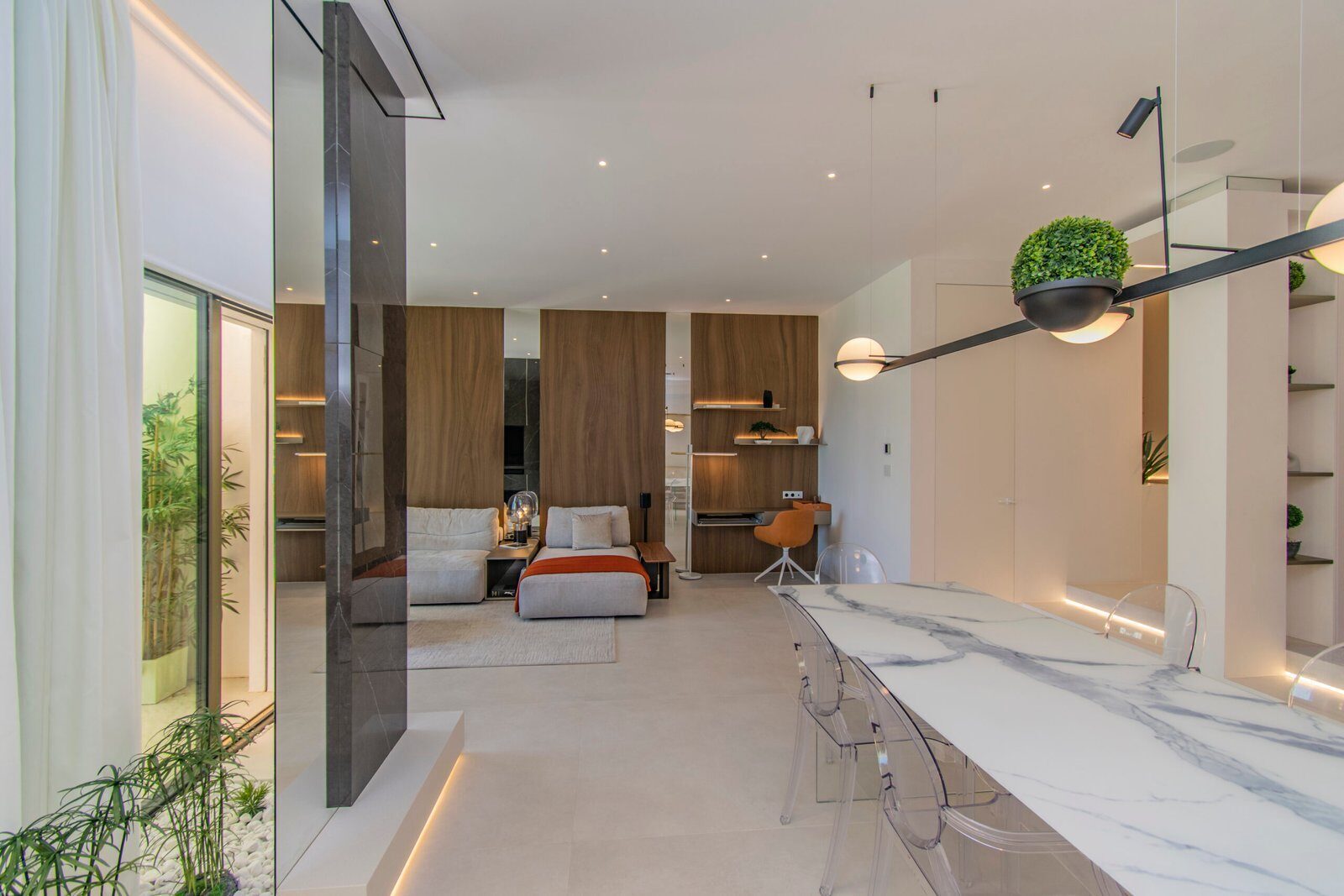 El salón es un espacio luminoso y acogedor, diseñado con una cocina abierta que fomenta la interacción y el disfrute de momentos en familia o con amigos. Las terrazas son ideales para relajarse y disfrutar del clima mediterráneo, ofreciendo un lugar perfecto para tomar el sol o cenar al aire libre con vistas al mar.