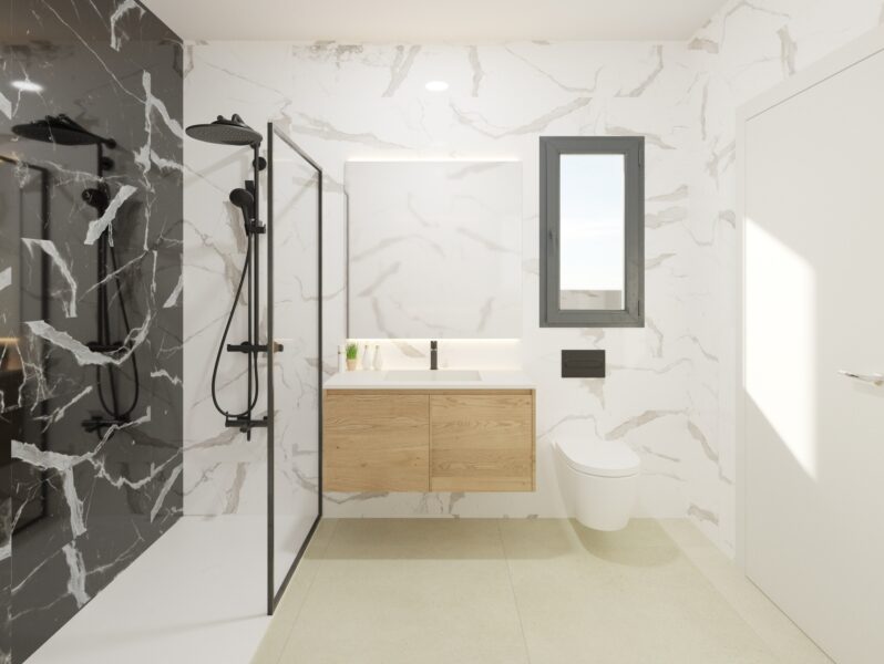 El interior de estas viviendas independientes en Ciudad Quesada está diseñado para ofrecer el máximo confort y funcionalidad. Con opciones de tres dormitorios y dos o tres baños, cada vivienda se adapta a las necesidades de diferentes tipos de familias. Los suelos de gres porcelánico aportan un toque de elegancia y son fáciles de mantener. Las viviendas están equipadas con aire acondicionado, asegurando un ambiente agradable durante todo el año. Las persianas eléctricas añaden comodidad y seguridad, mientras que los electrodomésticos modernos facilitan las tareas diarias. Los armarios empotrados ofrecen un amplio espacio de almacenamiento, manteniendo los espacios ordenados y libres de desorden. La distribución incluye un garaje, proporcionando un lugar seguro para estacionar vehículos. Además, las viviendas cuentan con una terraza que amplía el espacio habitable, permitiendo disfrutar de las vistas y del aire fresco.