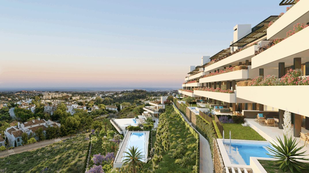 Imagina despertarte con vistas panorámicas de la costa y la bahía de Marbella que se extienden hasta África. Esa es la realidad para los residentes de este excepcional complejo con pisos de 3 y 4 dormitorios en Benahavis. El diseño en terrazas de los edificios garantiza que cada balcón ofrezca una vista impresionante, lo que te permite sumergirte en la belleza del paisaje mediterráneo.