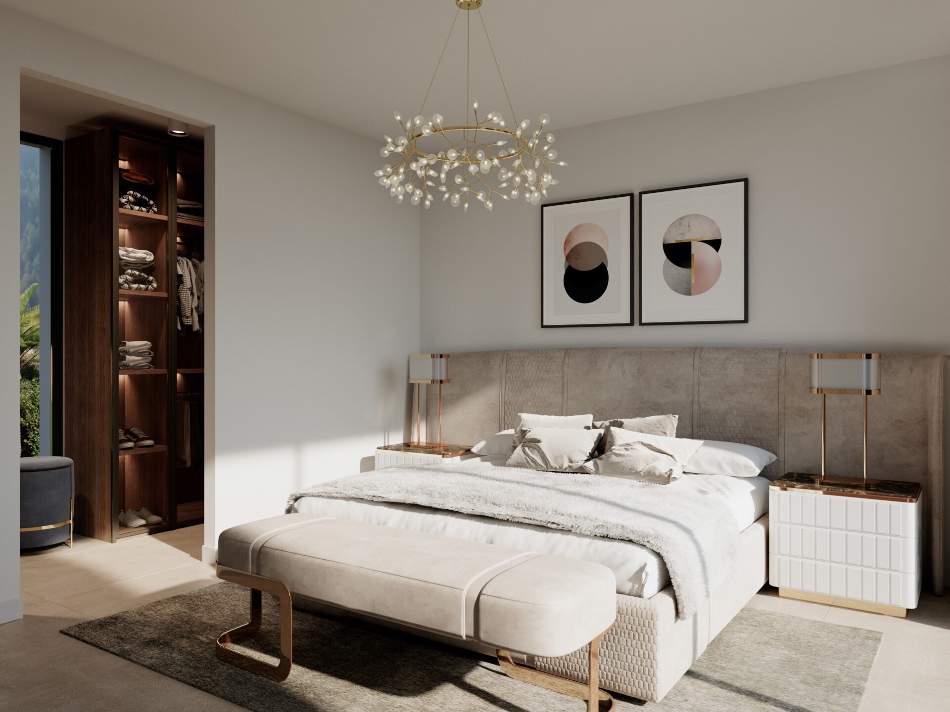 El interior de las villas está cuidadosamente diseñado para ofrecer el máximo confort y funcionalidad. Con cinco dormitorios y cuatro baños, estas propiedades son perfectas para familias o para recibir invitados. La distribución incluye un garaje, asegurando espacio para estacionamiento y almacenamiento. Los acabados de alta calidad incluyen suelos de gres porcelánico, que aportan durabilidad y un estilo moderno. Las villas están equipadas con electrodomésticos de última generación, domótica para un control eficiente del hogar, aire acondicionado para mantener una temperatura agradable durante todo el año, y calefacción por suelo radiante para los meses más fríos. Los armarios empotrados ofrecen un amplio espacio de almacenamiento, manteniendo el diseño interior limpio y ordenado.