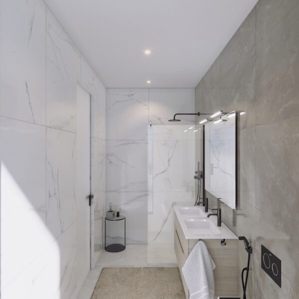 El interior de los adosados está diseñado para ofrecer confort y funcionalidad. Con tres dormitorios y dos baños, cada propiedad está pensada para maximizar el espacio y la comodidad. Los suelos de gres porcelánico aportan un toque de elegancia y son fáciles de mantener. La inclusión de domótica permite un control eficiente de las funciones del hogar, mejorando la seguridad y la eficiencia energética. Los armarios empotrados en los dormitorios ofrecen un almacenamiento práctico y discreto. Además, cada adosado cuenta con un solárium, un espacio perfecto para relajarse y disfrutar de las vistas.
