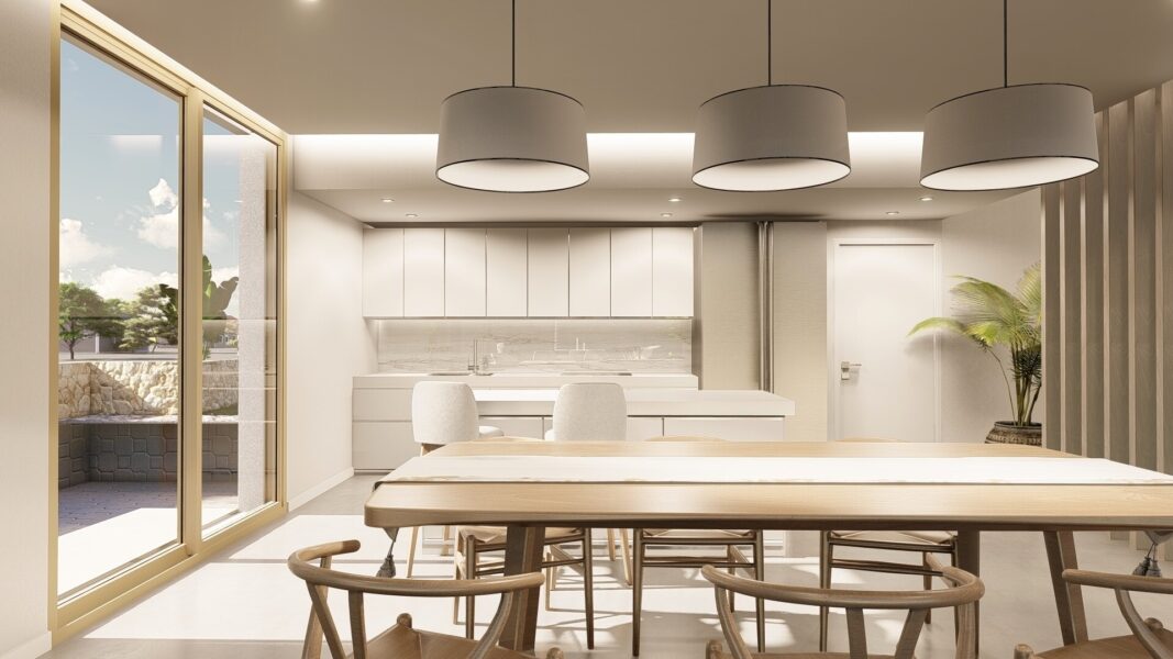 El interior de estas viviendas está diseñado para ofrecer la máxima comodidad y funcionalidad. Con opciones de 4 o 5 dormitorios y 3 a 5 baños, cada hogar se adapta a las necesidades familiares. Los suelos de gres porcelánico aportan un toque de elegancia y facilidad de mantenimiento. Las viviendas están equipadas con aire acondicionado, garantizando un ambiente agradable durante todo el año. Los armarios empotrados ofrecen un espacio de almacenamiento eficiente, mientras que la inclusión de electrodomésticos modernos asegura que cada cocina esté lista para su uso desde el primer día. Además, cada vivienda cuenta con un garaje, proporcionando un espacio seguro para el estacionamiento.
