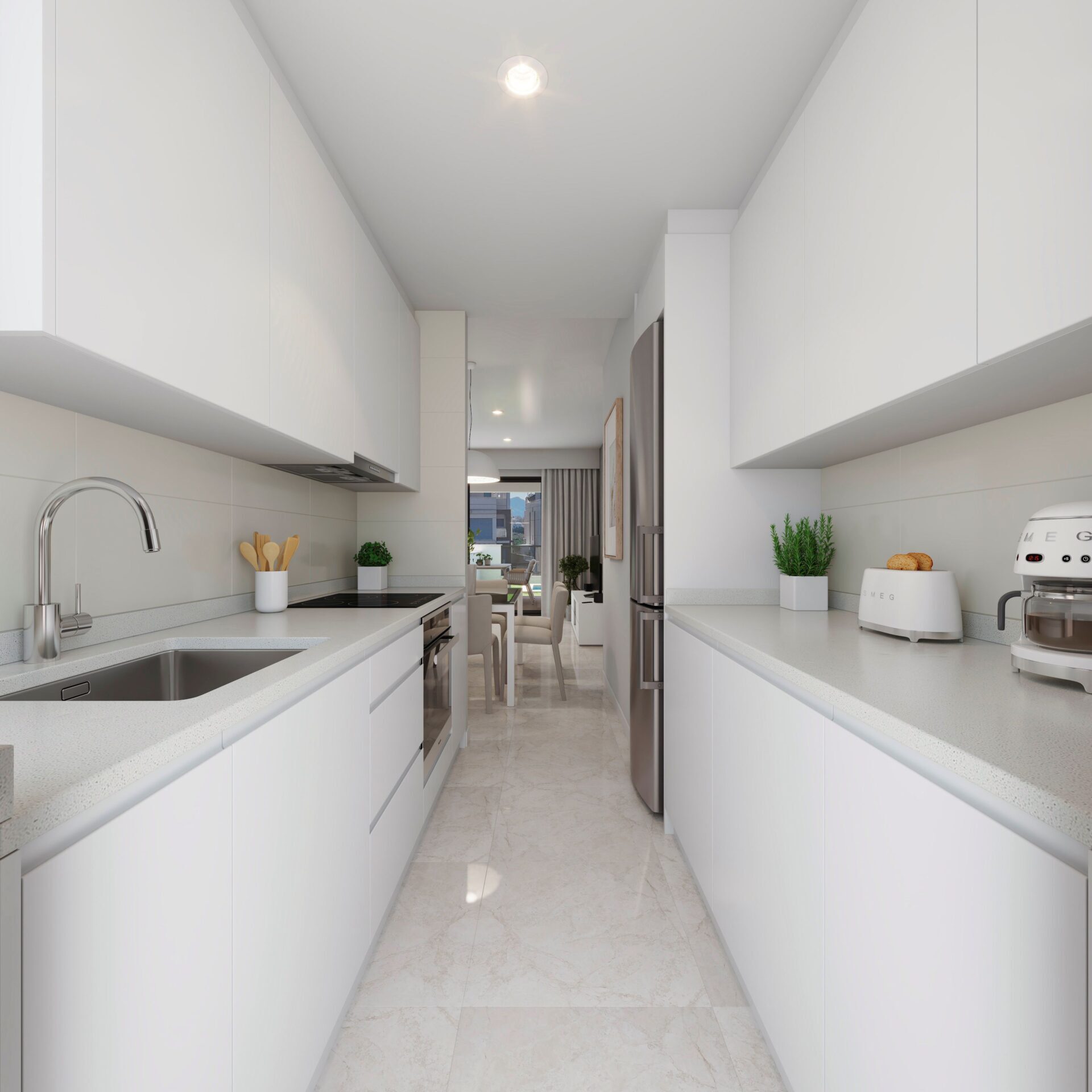 El interior de los bungalows está diseñado para ofrecer el máximo confort. Las propiedades disponen de 2 o 3 dormitorios, todos con armarios empotrados que optimizan el espacio. Los 2 baños están equipados con acabados modernos. La cocina incluye electrodomésticos, facilitando la vida diaria desde el primer día. El sistema de aire acondicionado asegura un ambiente agradable durante todo el año. Además, cada vivienda cuenta con un garaje, proporcionando comodidad y seguridad para el estacionamiento.