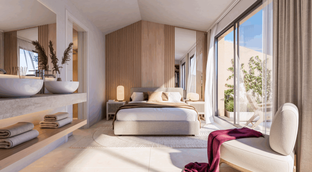 Los apartamentos han sido cuidadosamente diseñados para integrarse a la perfección con los espacios exteriores. Disfrute de las vistas desde la comodidad de su salón, comedor o cocina. Los apartamentos de 2 dormitorios y 2 baños también garantizarán su privacidad para los momentos más tranquilos. El dormitorio principal incluye un cuarto de baño en suite, con lavabo doble y aseo y ducha cerrados