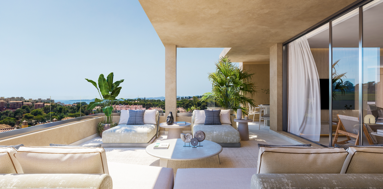 Apartamentos de elegante diseño, donde el lujo y la naturaleza se dan la mano. Grandes ventanales invitan a la luz natural en cada habitación, mientras que los espacios abiertos conducen a espectaculares terrazas con vistas infinitas al Golf Torrequebrada y al Mediterráneo