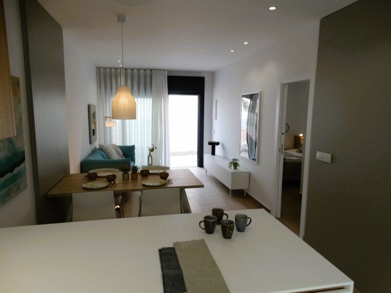 Los interiores de los bungalows en Pilar de la Horadada están diseñados para ofrecer comodidad y funcionalidad. Con opciones de 2 y 3 dormitorios, estos hogares se adaptan a diferentes necesidades familiares. Cada bungalow cuenta con 2 baños, asegurando privacidad y comodidad para todos los residentes. El diseño interior se centra en la optimización del espacio y la calidad de los acabados. Los suelos de gres porcelánico no solo aportan un toque moderno, sino que también son fáciles de mantener, ideales para un estilo de vida activo. Los armarios empotrados son una característica estándar, proporcionando soluciones de almacenamiento prácticas y eficientes. La preinstalación de aire acondicionado es un detalle que garantiza el confort durante todo el año, permitiendo a los residentes ajustar la temperatura a sus preferencias personales. La distribución de los espacios está pensada para maximizar la luz natural y crear un ambiente acogedor en cada estancia. Las terrazas privadas y, en el caso de los bungalows con solarium, los soláriums, añaden un valor extra a los interiores, ofreciendo una extensión del espacio habitable hacia el exterior, ideal para disfrutar del clima mediterráneo.