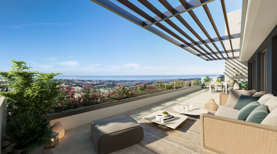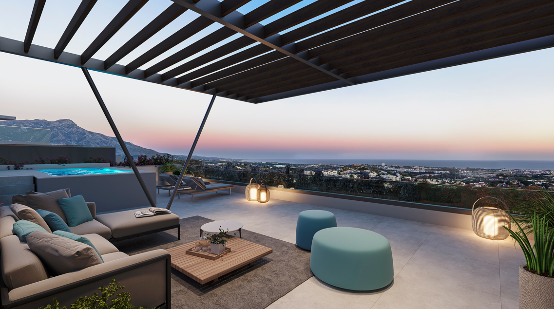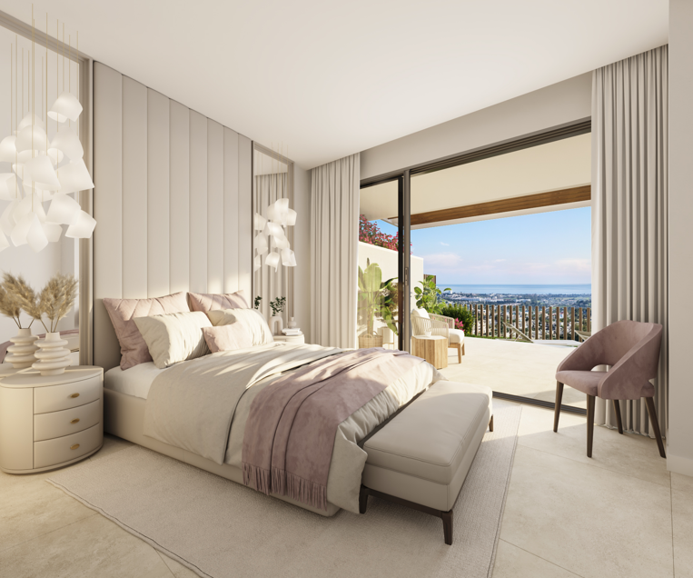 Imagina despertarte con vistas panorámicas de la costa y la bahía de Marbella que se extienden hasta África. Esa es la realidad para los residentes de este excepcional complejo con pisos de 3 y 4 dormitorios en Benahavis. El diseño en terrazas de los edificios garantiza que cada balcón ofrezca una vista impresionante, lo que te permite sumergirte en la belleza del paisaje mediterráneo.