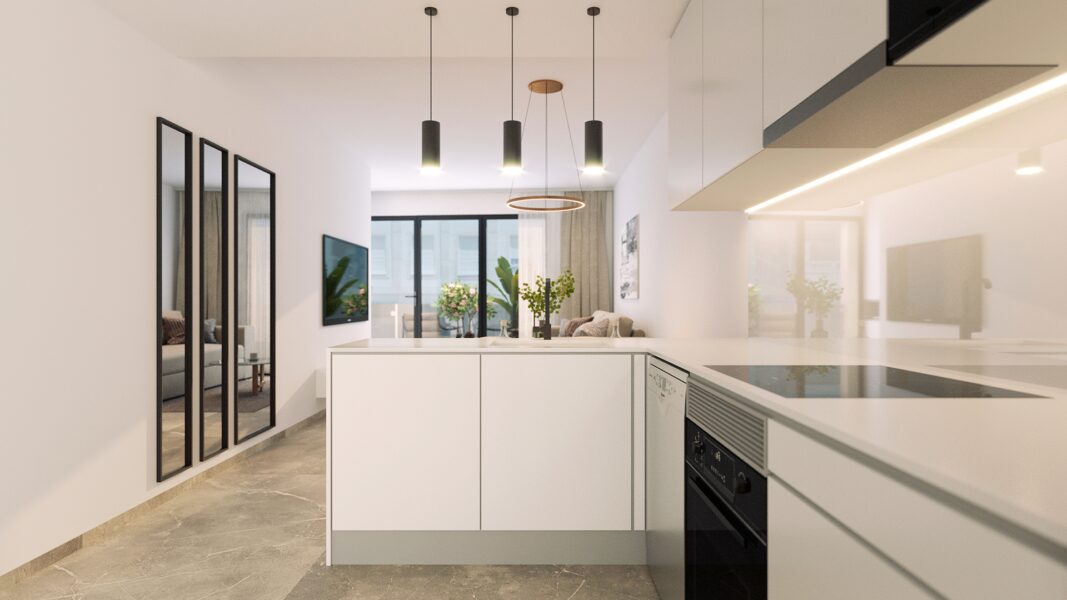 En el interior, las viviendas están equipadas con características que aseguran el máximo confort. El aire acondicionado instalado en cada propiedad garantiza un ambiente agradable durante todo el año, mientras que los armarios empotrados ofrecen soluciones de almacenamiento eficientes y elegantes. Las opciones de distribución incluyen 1 o 2 dormitorios y 1 o 2 baños, permitiendo elegir la configuración que mejor se adapte a las necesidades personales. Las terrazas privadas y, en algunos casos, los soláriums, añaden un toque especial, proporcionando espacios adicionales para el ocio y el relax.