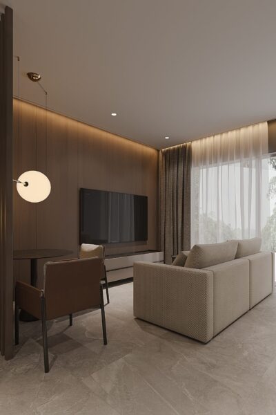 Los interiores de los apartamentos están diseñados para ofrecer el máximo confort y funcionalidad. Cada unidad cuenta con un dormitorio y un baño, ideales para parejas o personas que buscan un espacio acogedor. Los suelos de gres porcelánico aportan un toque de elegancia y son fáciles de mantener. Las persianas eléctricas y el aire acondicionado aseguran un ambiente confortable durante todo el año. Además, los armarios empotrados proporcionan un espacio de almacenamiento eficiente, manteniendo el orden y la organización en el hogar. La distribución está pensada para aprovechar al máximo el espacio disponible, creando un ambiente acogedor y funcional.