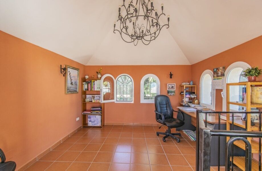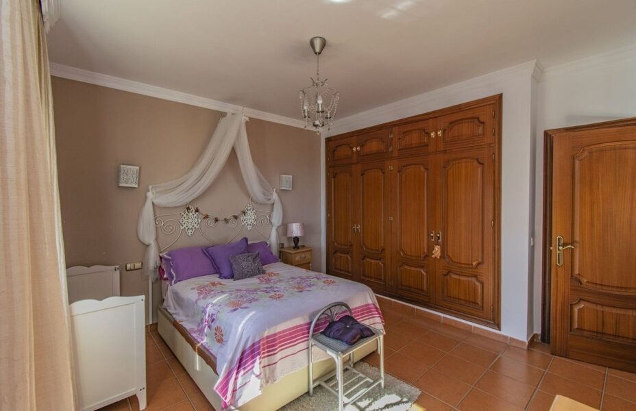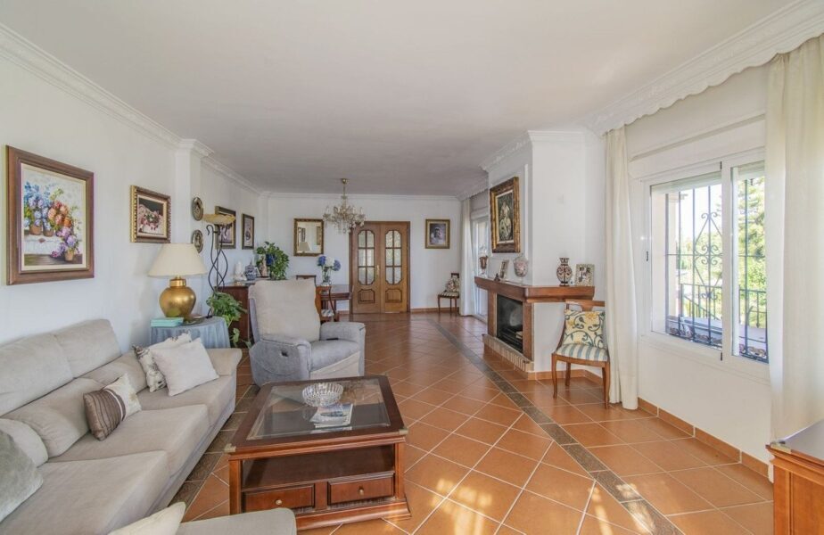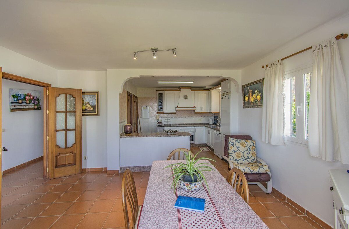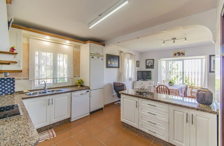 La villa cuenta con un total de cinco dormitorios y cuatro baños, lo que proporciona un amplio espacio para familias o aquellos que disfrutan de recibir invitados. La sala de estar está equipada con una acogedora chimenea, perfecta para relajarse por las tardes durante los meses más fríos, mientras que la gran cocina con comedor ofrece un espacio elegante y funcional para preparar comidas y entretenerse.
